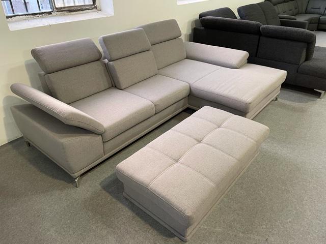 Cabrio sarokgarnitúra háttámla funkcióval (változtatható ülésmélység), állítható fejtámlákkal és karfákkal, szürke szövet kárpittal, modern króm lábakkal. Ez a termék extra akciós kiállított darab.